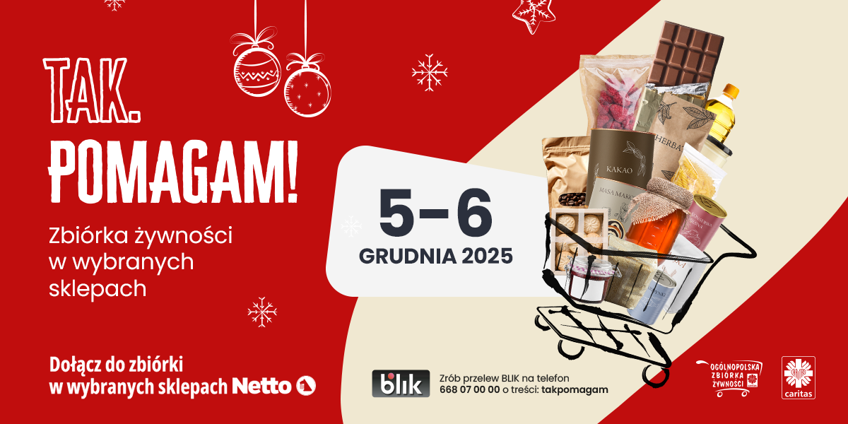 „Tak. Pomagam!” to hasło przedświątecznej zbiórki żywności, organizowanej przez Caritas Polska. Jej celem jest realne wsparcie osób znajdujących się w trudnej sytuacji życiowej przed świętami. Zebrane produkty trafią do paczek przygotowywanych przez lokalne oddziały Caritas i zostaną przekazane rodzinom oraz osobom samotnym i seniorom potrzebującym pomocy. W najbliższy piątek i sobotę odbędzie się już 27. jej edycja.