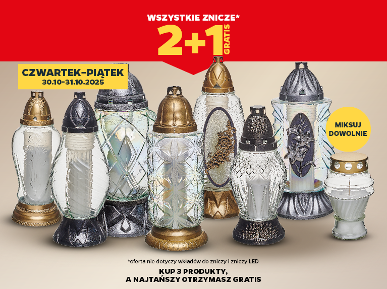 Przygotuj się na Wszystkich Świętych i skorzystaj z wyjątkowej oferty! W dniach 30 do 31 października 2025 wszystkie znicze w promocji 2+1! Kup dwa a trzeci, najtańszy produkt otrzymasz gratis!