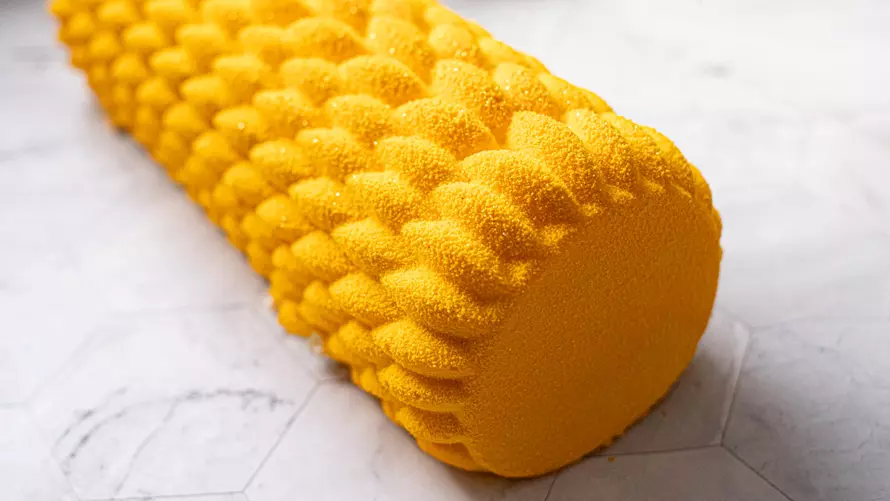 Gotowy mus od razu przelej do formy silikonowej do ⅔ jej wysokości. Włóż zmrożone ciasto miodowe przełożone kremem marakujowym. W razie potrzeby uzupełnij formę musem i wyrównaj powierzchnię. Wstaw do zamrażarki na minimum 12 godzin. Po tym czasie zaaplikuj zamsz i rozmrażaj deser w lodówce.