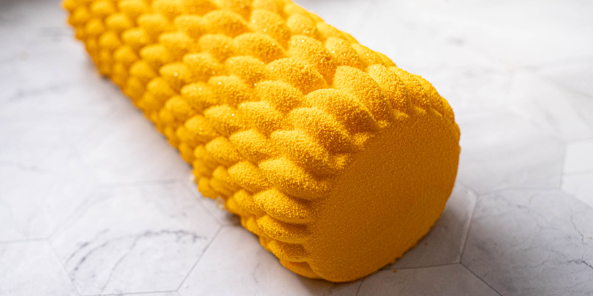 Gotowy mus od razu przelej do formy silikonowej do ⅔ jej wysokości. Włóż zmrożone ciasto miodowe przełożone kremem marakujowym. W razie potrzeby uzupełnij formę musem i wyrównaj powierzchnię. Wstaw do zamrażarki na minimum 12 godzin. Po tym czasie zaaplikuj zamsz i rozmrażaj deser w lodówce.