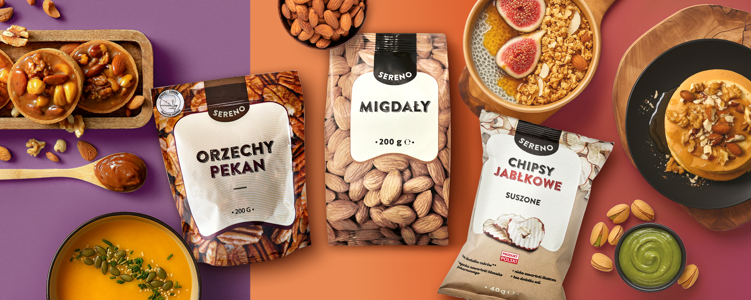 Sereno to pełna gama przekąsek - od klasycznych orzechów, przez pyszne mieszanki, aż po lekkie chipsy jabłkowe.