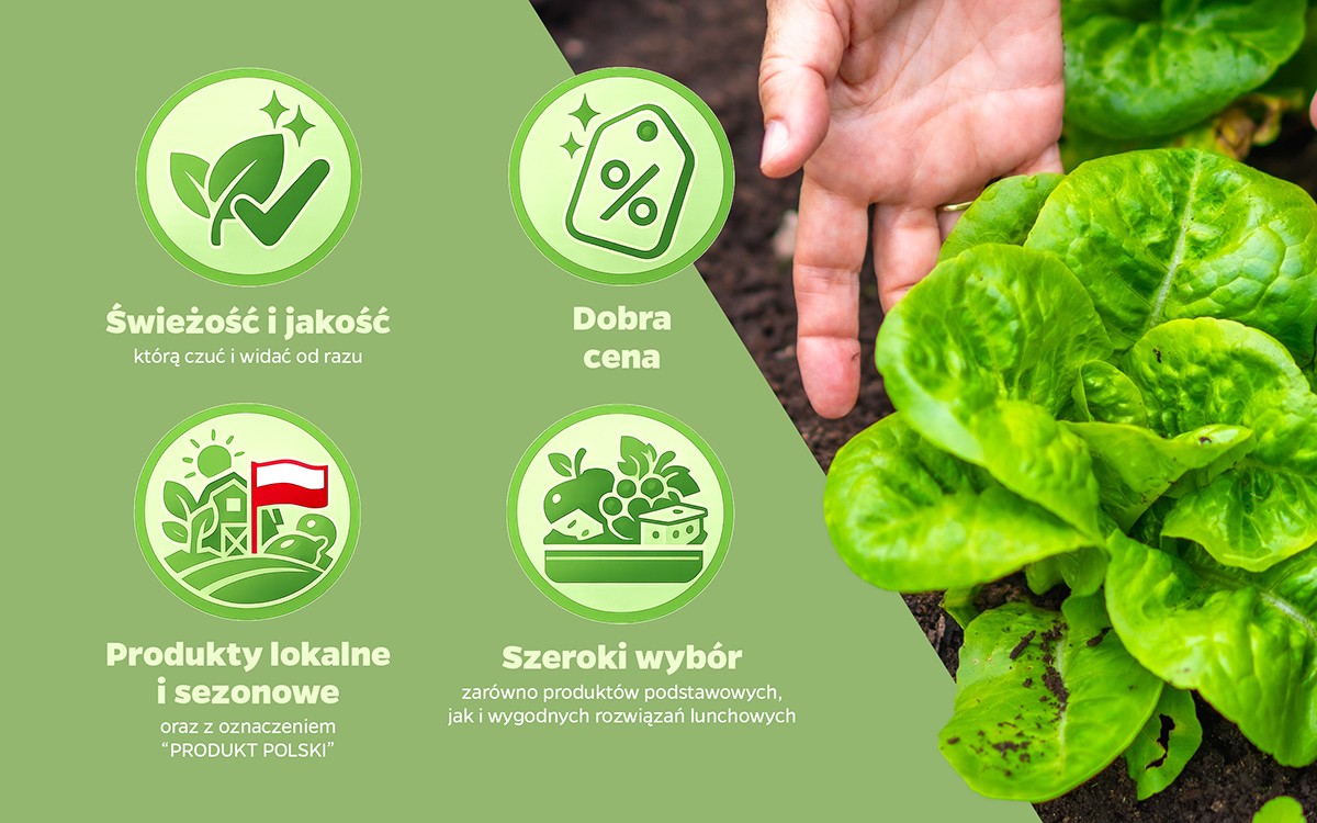 Nasz asortyment to ponad 90 produktów - od klasycznych warzyw i owoców, przez gotowe do spożycia lunchboxy i tłoczone soki NFC, aż po świeże zioła, sałaty i mieszanki do sałatek. Większość z nich pochodzi z Polski i dostępna jest zgodnie z naturalnym rytmem sezonu.